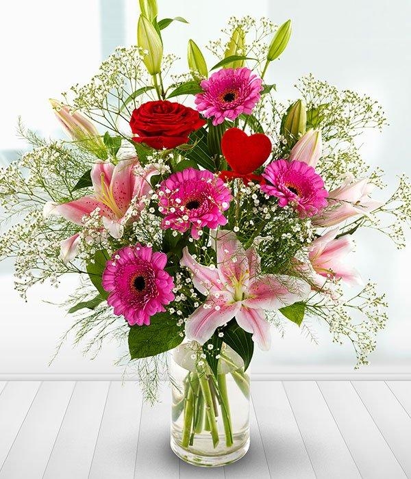 A pretty pink Valentine's Day Vase Arrangement of Lilies and Germini. With a single red Rose and a big heart at the centre, this Vase Arrangement says it all.