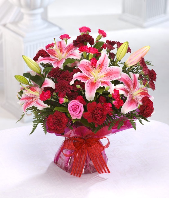 A sumptuous selection of flowers in rich reds, burgundy and pinks, featuring Lilies, Roses and Carnations, beautifully presented in a hand-tied for the perfect Valentine's Day delivery.