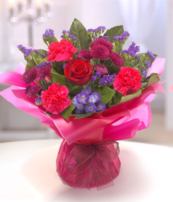 Aqua pack hand-tied bouquet delivered in water for freshness. Passionate, rich colours of red, purple and cerise. Containing a red Rose, Carnations, Chrysanthemum, Monte Cassino and Statice.