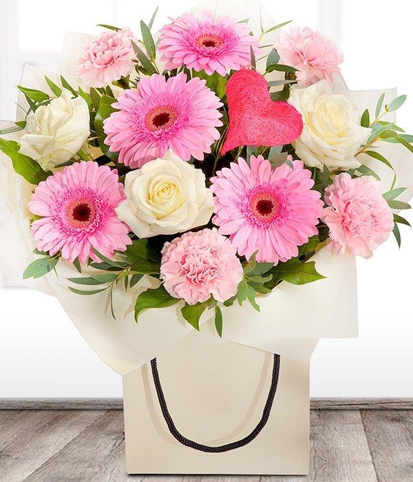 Beautiful handtied bouquet in a mixture of pink and cream.  A delightful gift for your Mum on Mothers Day.